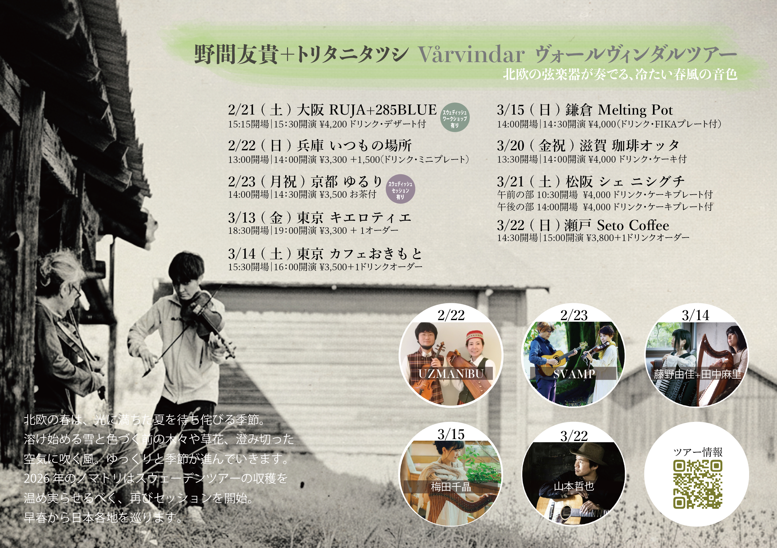 2年間のスウェーデン音楽留学以来、毎夏現地で音楽活動を続けているニッケルハルパ奏者トリタニタツシと、同国とノルウェーの国境地域で学んだ北欧音楽家の野間友貴。日本を代表する2人が北欧の様々な弦楽器を駆使し、 北欧伝統音楽の魅力に満ちたデュオスタイルで演奏します。 2026年のノマトリはスウェーデンツアーの収穫を温め実らせるべく、再びセッションを開始。早春から日本各地を巡ります。