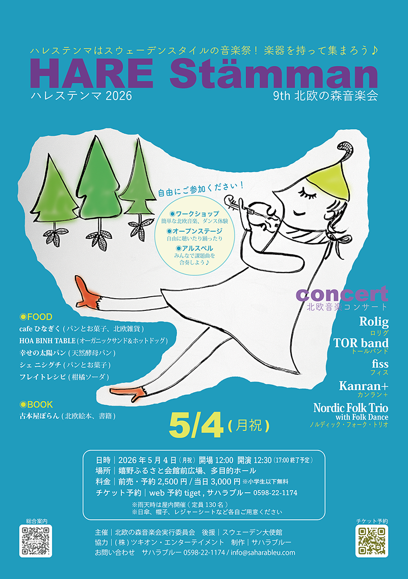 いよいよ5月4日は松阪で待ちに待った北欧伝統音楽の祭典[ハレステンマ2026]、そして5月6には奈良でカンラン+の夏至コンサートが開催されます!